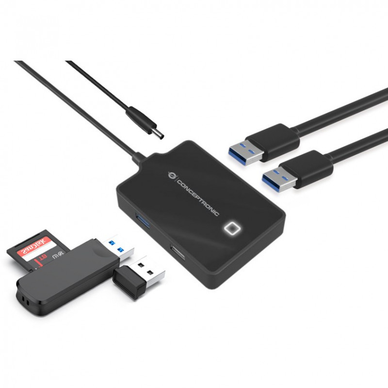 "Conceptronic HUBBIES 4-Port USB 3.0/2.0 Hub, 90cm cable. Host interface: USB 3.2 Gen 1 (3.1 Gen 1) Type-A. Product colour: Black, Hub interfaces: USB 2.0, USB 3.2 Gen 1 (3.1 Gen 1) Type-A, Country of origin: China. Width: 87 mm, Depth: 55 mm, Height: 15 mm. Quantity per pack: 1 pc(s), Package width: 107 mm, Package depth: 18 mm. Cables included: USB"\n"This 4 ports USB 3.0/2.0 hub makes it possible to expand your netbook, notebook or PC with 4 extra ports with only using one free USB port! You can easily add up to 4 USB devices or gadgets to your netbook, notebook or PC."
