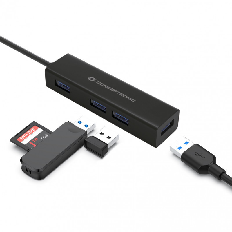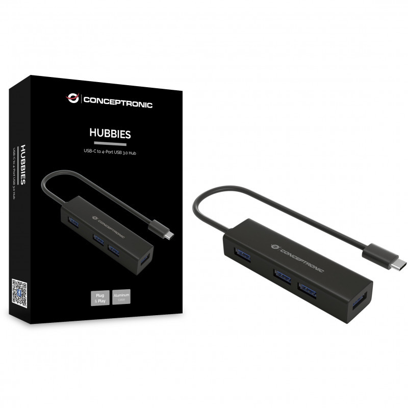 "Conceptronic HUBBIES USB-C to 4-Port USB 3.0 Hub. Host interface: USB 3.2 Gen 1 (3.1 Gen 1) Type-C, Hub interfaces: USB 3.2 Gen 1 (3.1 Gen 1) Type-A. Data transfer rate: 5000 Mbit/s, Product colour: Black, Housing material: Aluminium. Width: 87.5 mm, Depth: 23.4 mm, Height: 16.5 mm. Quantity per pack: 1 pc(s), Package width: 112.5 mm, Package depth: 24.5 mm"\n"This 4 ports USB 3.0 hub makes it possible to expand your device’s USB Type-C capacity with 4 extra USB 3.0 ports! The HUBBIES07B makes it easy to add up to 4 USB-compatible peripherals or gadgets to your MacBook, Chromebook Pixel or any similar late-model laptop with USB Type-C ports."
