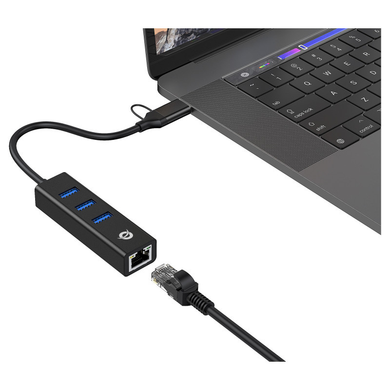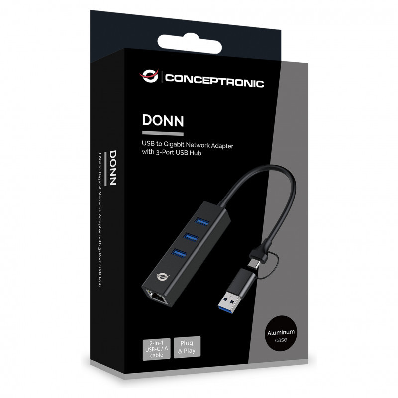 "Conceptronic DONN07BA USB to Gigabit Network Adapter with 3-Port USB Hub, USB-A x 3, Wake-on-LAN, 2-in-1 USB-C USB-A Cable. Connectivity technology: Wired, Host interface: USB Type-A/USB Type-C, Interface: Ethernet. Maximum data transfer rate: 5000 Mbit/s. USB powered. Product colour: Black"\n"The Conceptronic USB Hub and Gigabit Ethernet Combo Adapter allows you to connect to the internet easily through the built-in USB port on your laptop. This is an ideal solution for MacBook or other Windows computers that may have wireless built-in but don’t come with an Ethernet port. The adapter also combines a regular USB hub. So you can connect external USB peripherals, such as a MP3 player, digital camera, printer or pen drive."
