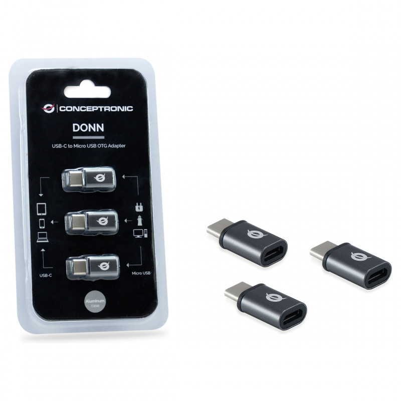 "Conceptronic DONN USB-C to Micro USB OTG Adapter 3-Pack. Connector 1: USB 2.0 Type-C, Connector 2: USB 2.0 Micro. Product colour: Black"\n"The USB-C OTG Adapter lets you charge and sync USB Type C mobile devices, such as the Samsung Galaxy S8, S8+, Nexus™ 6P, and 5X phones, using a Micro USB cable. The compact adapter is portable enough for carrying as a tablet accessory and it reduces the number of cables that you need to carry around with you in order to charge all of your mobile devices."