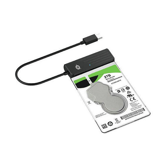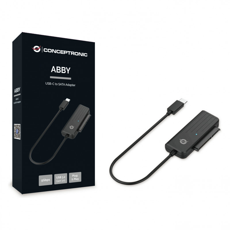 "Conceptronic ABBY USB-C to SATA Adapter. Product colour: Black, Country of origin: China. Width: 32 mm, Depth: 12 mm, Height: 65 mm. Quantity per pack: 1 pc(s), Package width: 75 mm, Package depth: 20 mm. Products per master (outer) case: 50 pc(s), Master (outer) case width: 230 mm, Master (outer) case length: 180 mm. Data transfer rate: 5 Gbit/s"\n"The USB to SATA adapter easily adds an external 2.5"""" SATA solid-state drive or hard drive to your PC or laptop, offering a steady and efficient data transmission with transfer rate of up to 6Gbps.