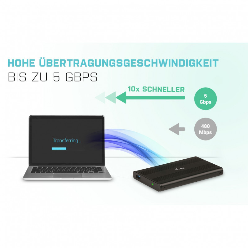 "i-tec Advance MySafe AluBasic 2.5"" USB 3.0. Product type: HDD/SSD enclosure. Number of storage drives supported: 1, Storage drive size: 2.5"", Supported storage drive interfaces: Serial ATA, Serial ATA II, Serial ATA III. Data transfer rate: 5 Gbit/s. Product colour: Black"\n"The ADVANCE Series is the highest level of i-tec accessories bringing you the cutting edge technologies of products with a modern design and exclusive packaging.