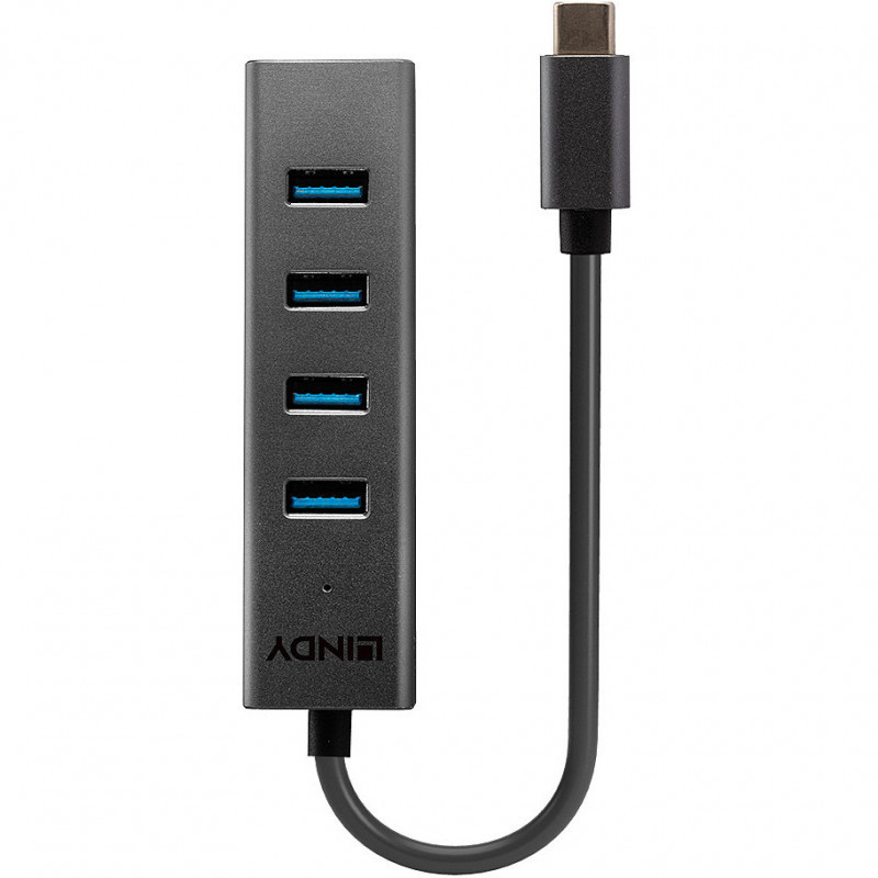 "Lindy 4 Port USB 3.2 Type C Hub. Host interface: USB 3.2 Gen 1 (3.1 Gen 1) Type-C, Hub interfaces: USB 3.2 Gen 1 (3.1 Gen 1) Type-A. Data transfer rate: 5000 Mbit/s, Product colour: Grey, Housing material: Aluminium, Plastic. Width: 103 mm, Depth: 26 mm, Height: 18 mm. Quantity per pack: 1 pc(s), Package width: 174 mm, Package depth: 20 mm"\n"The Lindy 4 Port USB 3.2 Hub provides 4 USB Type A SuperSpeed ports for connecting USB peripherals to a USB Type C equipped computer. Capable of data transfer speeds of up to 5Gbps, the hub is also backwards compatible with USB 2.0 and 1.1.