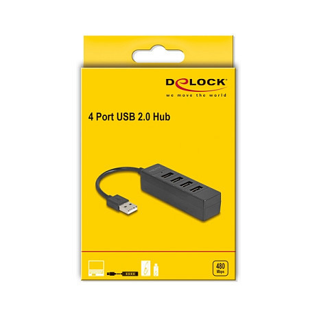 "DeLOCK 64334. Host interface: USB 2.0 Type-A, Hub interfaces: USB 2.0 Type-A. Data transfer rate: 480 Mbit/s, Product colour: Black, Housing material: Acrylonitrile butadiene styrene (ABS). Power supply type: USB, Input voltage: 5 V, Input current: 0.5 A. Windows operating systems supported: Windows 10, Windows 10 x64, Windows 11, Mac operating systems supported: Mac OS X 12.0 Monterey, Mac OS X 13.0 Ventura, Mac OS X 14.0 Sonoma, Mac OS X 15.0 Sequoia, Linux operating systems supported: Linux Kernel 5.15, Linux Kernel 5.19, Linux Kernel 5.4, Linux Kernel 5.8, Linux Kernel 5.9, Linux.... Width: 23 mm, Depth: 83 mm, Height: 20 mm"\n"The USB hub by Delock can be connected via USB Type-A interface to a PC or laptop. It has four USB Type-A connectors. Different USB devices such as USB flash memory, card reader, external enclosure etc. can be connected.