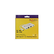 "DeLOCK 87731. Host interface: USB 3.2 Gen 1 (3.1 Gen 1) Type-C. Product colour: Grey, White, Hub interfaces: HDMI, RJ-45, USB 3.2 Gen 1 (3.1 Gen 1) Type-A, USB 3.2 Gen 1 (3.1 Gen 1) Type-C, VGA. Windows operating systems supported: Windows 10, Windows 8.1, Mac operating systems supported: Mac OS X 10.9 Mavericks, Other operating systems supported: Android. Width: 52 mm, Depth: 103 mm, Height: 16 mm. Cable length: 0.14 m"\n"This docking station by Delock can be connected to a computer with a USB-C™ Alt Mode or Thunderbolt™ 3 port and provides a variety of interfaces. One monitor can be operated at the HDMI or VGA output. One built-in USB Type-A port allows the use of peripherals. With a USB-C™ power supply, laptops such as the MacBook or Chromebook can be charged during operation."
