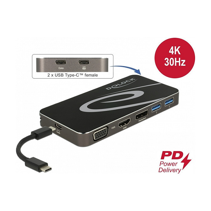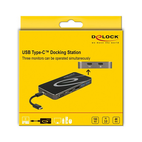 "DeLOCK USB Type-C 3.2 Dockingstation 4K HDMI DP / 1080p VGA, USB Hub und PD 3.0. Connectivity technology: Wired, Host interface: USB 3.2 Gen 1 (3.1 Gen 1) Type-C, USB Power Delivery up to: 4.5 W. Product colour: Black, Maximum digital resolution: 3840 x 2160 pixels, Country of origin: China. Windows operating systems supported: Windows 10, Windows 10 x64, Windows 8.1, Windows 8.1 x64, Mac operating systems supported: Mac OS X 10.15.3 Catalina, Mobile operating systems supported: Android 9.0. Width: 63 mm, Depth: 127 mm, Height: 14 mm. Cables included: USB Type-C to USB Type-C"\n"This docking station by Delock can be connected to a computer with a USB-C Alt-Mode or Thunderbolt 3 port and provides a variety of interfaces. Three monitors can be operated simultaneously at the DisplayPort, HDMI and VGA outputs. Two built-in USB Type-A ports and one USB Type-C port allows the use of peripherals.