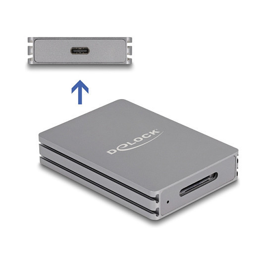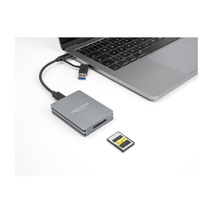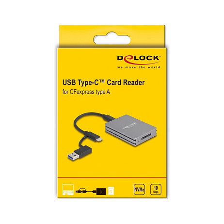 "DeLOCK USB Type-C Card Reader for CFexpress type A memory cards. Compatible memory cards: CFexpress Type A, Product colour: Grey, Data transfer rate: 10000 Mbit/s. Interface: USB 3.2 Gen 2 (3.1 Gen 2) Type-C. Width: 50 mm, Depth: 70 mm, Height: 13 mm. Quantity per pack: 1 pc(s), Package type: Box. Cables included: USB Type-C to USB Type-C"\n"The card reader by Delock can be used for reading and writing CFexpress memory cards. The card reader can be connected to a PC or a mobile device via the USB interface.