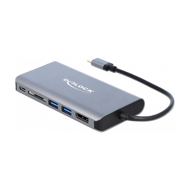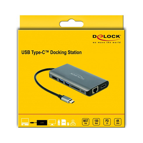 "DeLOCK 87683. Connectivity technology: Wired, Host interface: USB 3.2 Gen 1 (3.1 Gen 1) Type-C. Ethernet LAN data rates: 10,100,1000 Mbit/s. Product colour: Grey, Compatible memory cards: SD, SDHC, SDXC, HD type: 4K Ultra HD. Power source type: USB, Power cable length: 0.2 m. Windows operating systems supported: Windows 10, Windows 7, Windows 8.1, Mac operating systems supported: Mac OS X 10.13 High Sierra, Mac OS X 10.14 Mojave, Other operating systems supported: ChromeOS"\n"This docking station by Delock can be connected to a computer with a USB-C™ DP Alt Mode or Thunderbolt™ 3 port and provides a variety of interfaces. Two monitors can be operated simultaneously at the DisplayPort and HDMI outputs. Three built-in USB ports allow the use of peripherals, and connections for Gigabit network, as well as an SD card reader, complete the features.