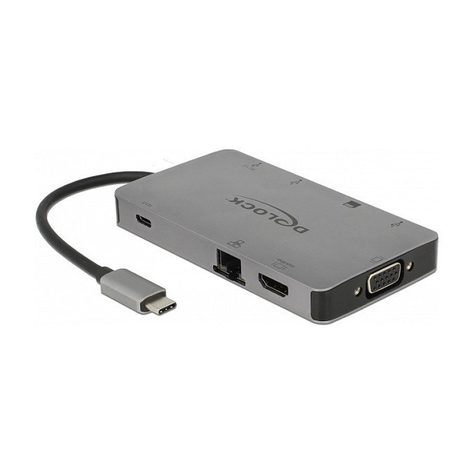 "DeLOCK 87735. Connectivity technology: Wired, Host interface: USB 3.2 Gen 1 (3.1 Gen 1) Type-C. Product colour: Grey, Compatible memory cards: SD, SDHC, SDXC, Maximum digital resolution: 3840 x 2160 pixels. Width: 110 mm, Depth: 59 mm, Height: 12 mm. Quantity per pack: 1 pc(s)"\n"This docking station by Delock can be connected to a computer with a USB-C™ DP Alt Mode or Thunderbolt™ 3 port and provides a variety of interfaces. One monitor can be operated at the HDMI or VGA output. Three built-in USB ports allow the use of peripherals, and connections for gigabit network, as well as an SD / micro SD card reader, complete the features.