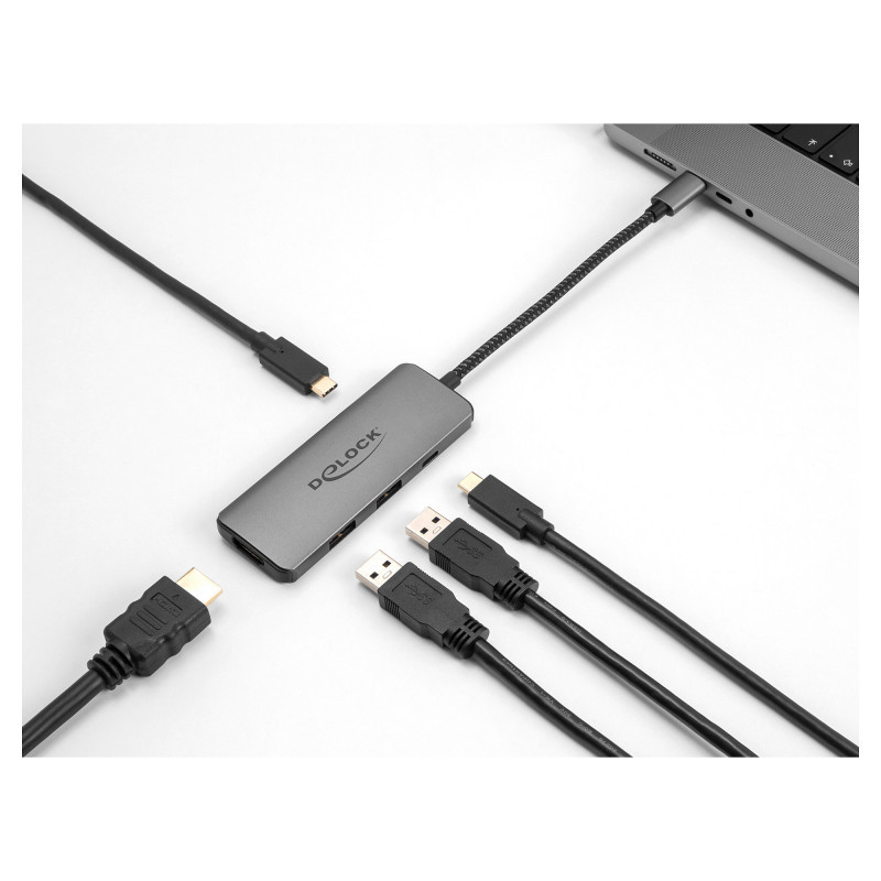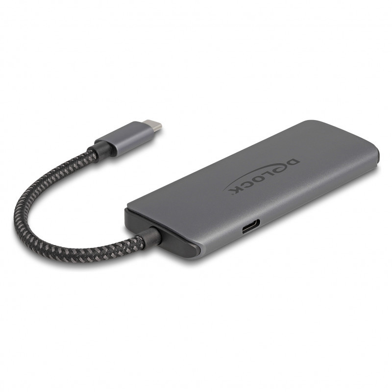 "DeLOCK USB Type-C Docking Station 8K - HDMI / USB / PD 3.0 100 W. Connectivity technology: Wired, Host interface: USB 3.2 Gen 1 (3.1 Gen 1) Type-C, USB Power Delivery up to: 100 W. Product colour: Grey, Data transfer rate: 5 Gbit/s, HD type: 8K Ultra HD. Power source type: USB, USB cable length: 0.15 m. Windows operating systems supported: Windows 10, Windows 11, Windows 8.1, Mac operating systems supported: Mac OS X 12.0 Monterey, Mac OS X 13.0 Ventura, Linux operating systems supported: Linux Kernel 5.11, Linux Kernel 5.12, Linux Kernel 5.13, Linux Kernel 5.14, Linux Kernel 5.15. Width: 37 mm, Depth: 97 mm, Height: 10 mm"\n"This docking station by Delock can be connected to a computer with a USB-C™ DP Alt Mode or Thunderbolt™ 3 or Thunderbolt™ 4 port and provides a variety of interfaces. A monitor can be operated at the HDMI output port by a maximum resolution up to 8K Ultra HD (7680 x 4320 @ 30 Hz). Two built-in USB Type-A and one USB-C™ port allow the use of peripherals.