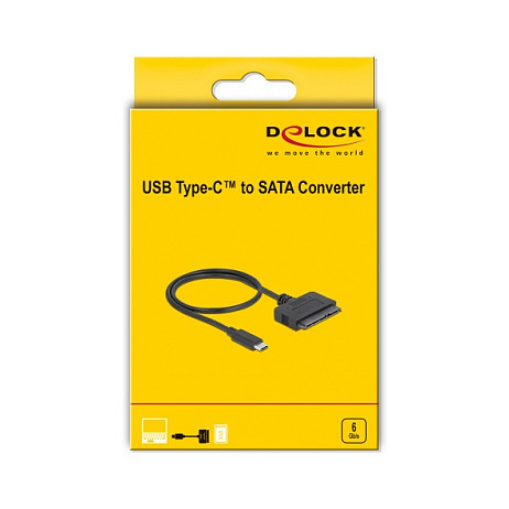 "DeLOCK USB Type-C Converter to 22 pin SATA 6 Gb/s. Connector 1: USB C, Connector 2: 22-pin SATA, Cable length: 0.5 m. Product colour: Black"\n"This Delock converter can be connected via USB-C™ interface to a PC or laptop. Thus a 2.5″ SATA HDD or SSD with a 22 pin SATA interface can be used."