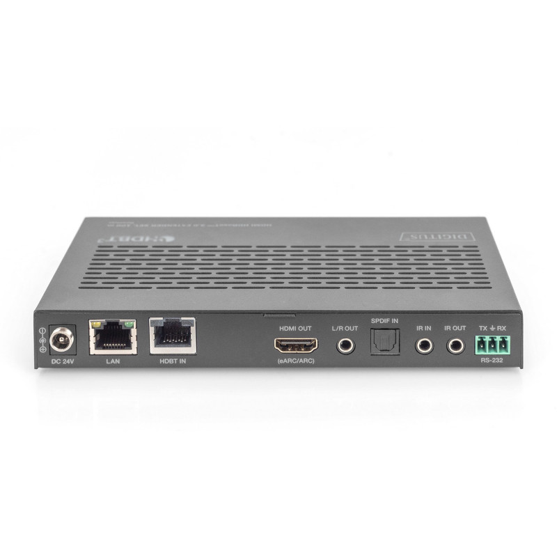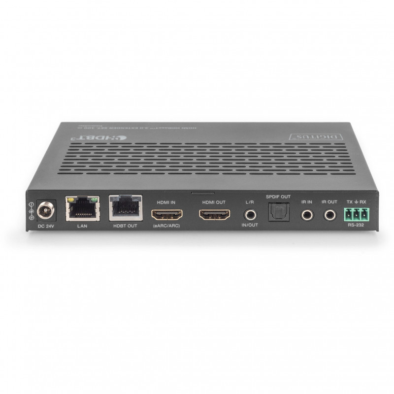The DIGITUS® HDMI HDBaseT™ 3.0 Extender Set enables uncompressed AV signal transmission in 4K/60Hz, 4:4:4 at 18 GB/s over a distance of 100 m via CAT 6A (or higher) cables. Both on the transmitter and on the receiver, there are two USB-A ""Device"" ports as well as a USB-B ""Host"" connection. This allows USB signals, e.g. for KVM, USB data carriers etc., to be integrated on both ends and connected to the processing PC on the respective opposite end. Both devices can be switched between ""Host"" and ""Device"" mode using a DIP switch. The system enables bidirectional transmission of PoC (Power over Cable) and IR. Via RS232, both devices can be controlled separately. Analog stereo audio decoupling is also available. Another impressive feature is versatile eARC/ARC compatibility, which enables the connection to new and older audio devices such as AVRs (Audio Video Receiver). Two modes (ARC, S/PDIF) are available here, which can also be toggled very easily using a changeover switch."