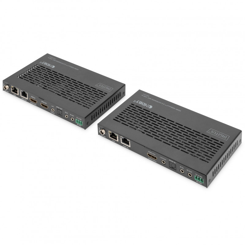 "Digitus HDMI HDBaseT™ 3.0 Extender Set, 100 m. Type: Transmitter & receiver, Connectivity technology: Wired, Maximum transfer distance: 100 m. Transmitter video port type: HDMI, Transmitter local video port type: HDMI, Transmitter local keyboard/mouse port type: USB. Receiver local video port type: HDMI, Receiver local keyboard/mouse port type: USB. USB port type: USB Type-A, USB data transfer rates: 480 Mbit/s. AC adapter output voltage: 24 V, AC adapter output current: 1 A"\n"Uncompressed signal transmission in 4K/60Hz, 4:4:4 at 18 GB/s over a distance of 100 m via CAT 6A (or higher) cables