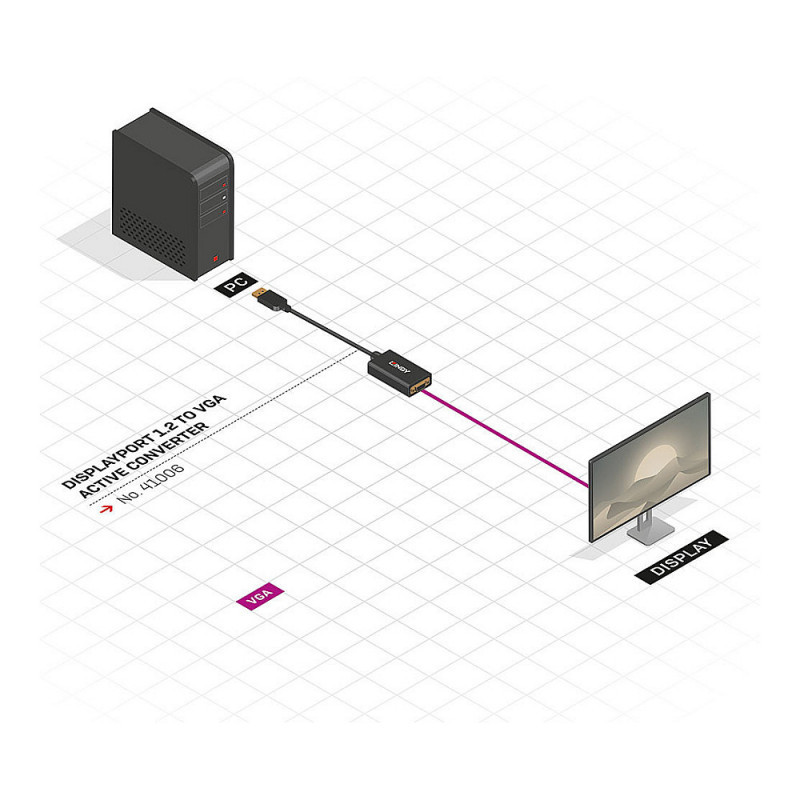 "Lindy DisplayPort 1.2 to VGA Active Converter. Cable length: 0.15 m, Connector 1: VGA (D-Sub), Connector 2: DisplayPort. Certification: CE, UKCA, FCC, RoHS, REACH. Cable diameter: 6.5 mm, Connector 1 dimensions (WxDxH): 38 x 61 x 17 mm, Connector 2 dimensions (WxDxH): 20 x 36 x 11 mm. Package width: 160 mm, Package depth: 20 mm, Package height: 160 mm. Quantity per pack: 1 pc(s)"\n"The Lindy DisplayPort 1.2 to VGA Converter is ideal for connecting a DisplayPort equipped source such as a PC or laptop to a VGA monitor. It supports high definition video resolutions up to 1920x1080@60Hz. Active conversion ensures compatibility with various graphics cards including AMD Eyefinity, NVIDIA surround and Intel Collage.