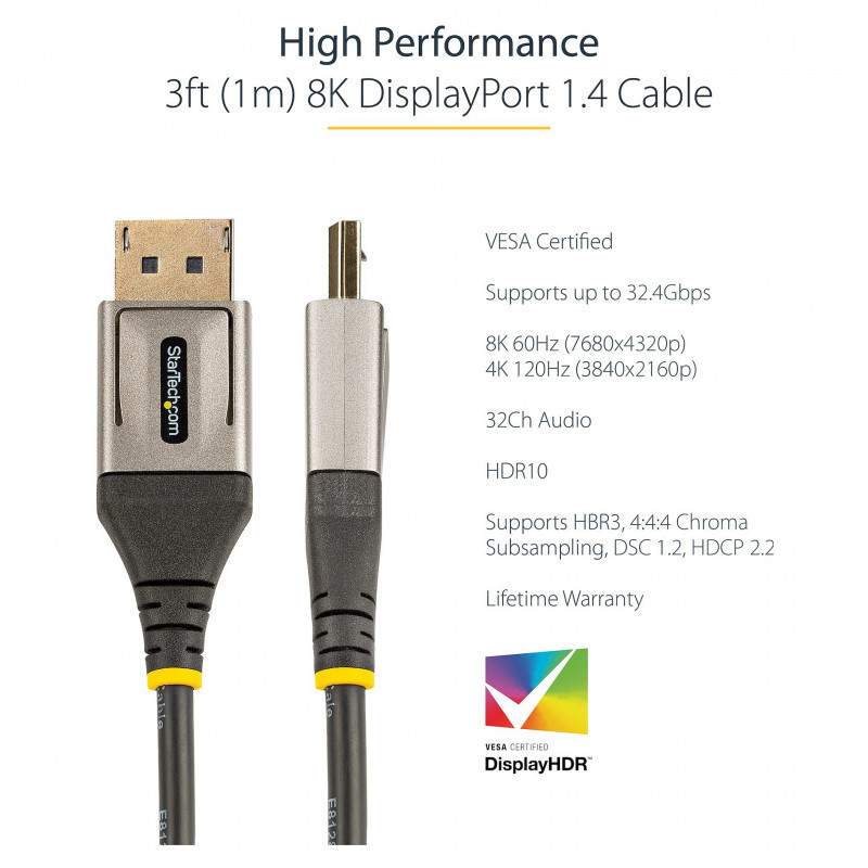 "StarTech.com 3ft (1m) VESA Certified DisplayPort 1.4 Cable - 8K 60Hz HDR10 - Ultra HD 4K 120Hz Video - DP 1.4 Cable / Cord - For Monitors/Displays - DisplayPort to DisplayPort Cable - M/M. Cable length: 1 m, Connector 1: DisplayPort, Connector 2: DisplayPort. Compliance certificates: RoHS. Cable diameter: 4.5 mm, Weight: 56 g. Package width: 220 mm, Package depth: 200 mm, Package height: 20 mm. Quantity per pack: 1 pc(s)"\n"VESA Certified DisplayPort 1.4 Cable - 8K 60Hz HDR10 - 3.3 ft. (1 m)