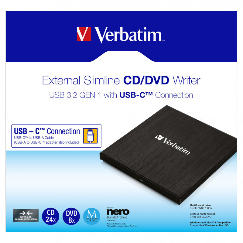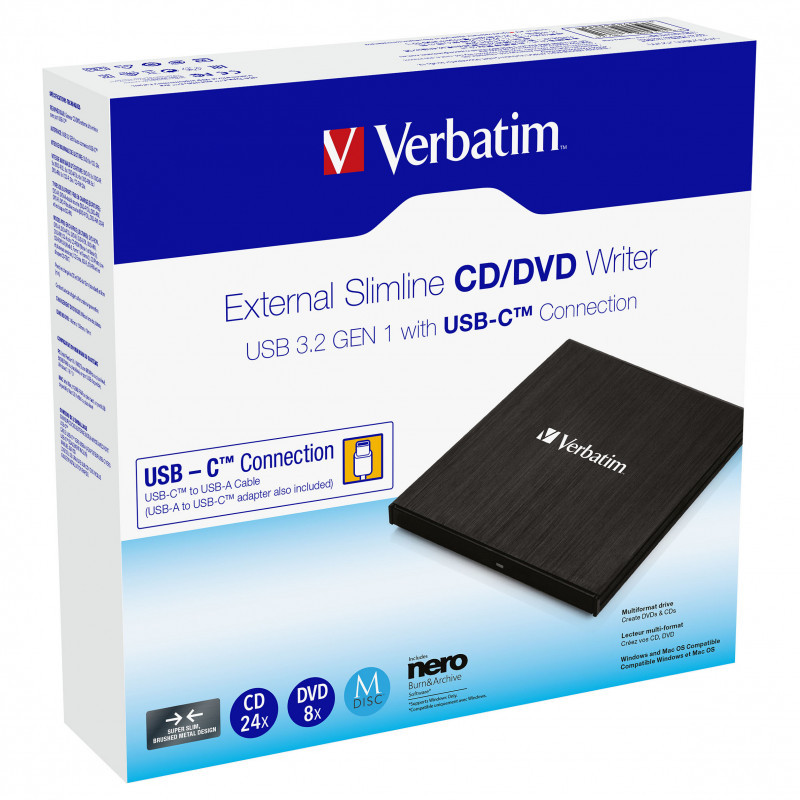 Verbatim Externer Slimline CD/DVD-Brenner mit USB-C-Anschluss