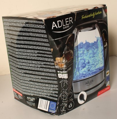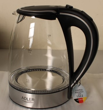 SALE OUT. Adler AD 1225 Cordless Water Kettle, 1.7L, 2000W, Anti-calc filter, Boil-dry protection, Rotary base 360 degree | Adler | Kettle | AD 1225 | Standard | 2000 W | 1.7 L | Glass | 360° rotational base | Stainless steel/Black | DAMAGED PACKAGING, SCRATCHES KETTLE TOP AND BOTTOM OF THE SOLE