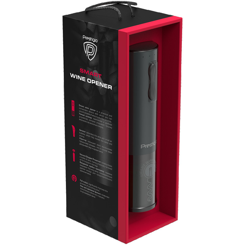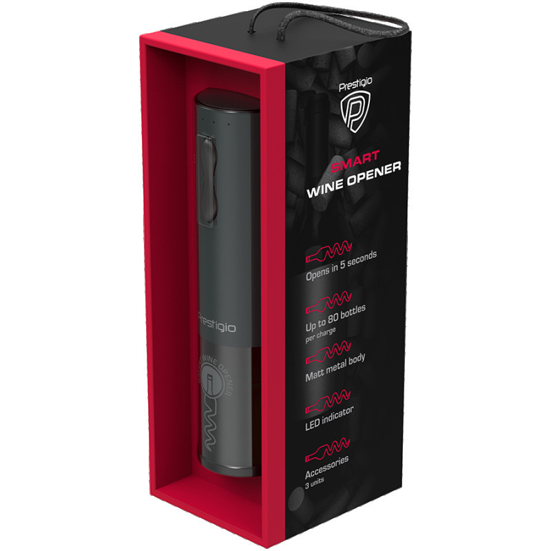 Bolsena Electric Wine Opener“ – modernus elektrinis vyno atidarytuvas su Prestigio logotipu, skirtas lengvam ir greitam vyno butelių atidarymui. Komplekte yra vyno aeratorius, kuris pagerina gėrimo skonį, bei vakuuminis butelių konservatorius, padedantis išlaikyti vyną šviežią ilgesnį laiką. Juodos spalvos dizainas suteikia elegancijos ir dera prie bet kurios virtuvės ar baro aplinkos. Patogus, greitas ir stilingas sprendimas vyno mėgėjams.