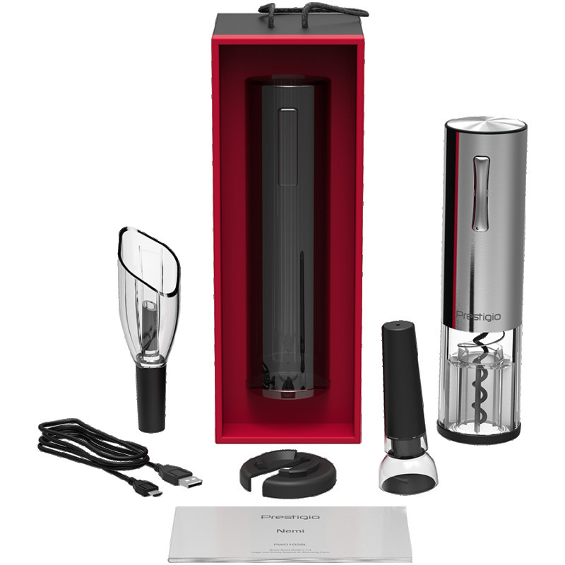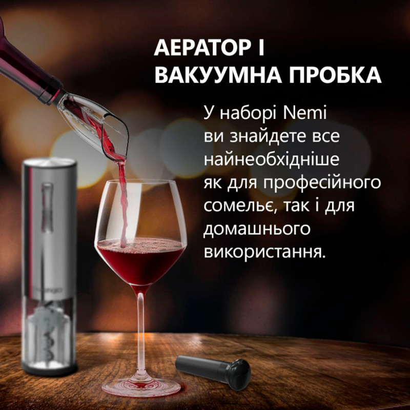 „Nemi Electric Wine Opener“ – modernus elektrinis vyno atidarytuvas, skirtas lengvam ir greitam butelių atidarymui. Komplekte yra vyno aeratorius, kuris pagerina gėrimo skonį, bei vakuuminis butelių konservatorius, padedantis išlaikyti vyną šviežią ilgesnį laiką. Sidabrinės spalvos dizainas suteikia elegancijos ir dera prie bet kurios virtuvės ar baro aplinkos. Patogus, greitas ir stilingas sprendimas vyno mėgėjams.