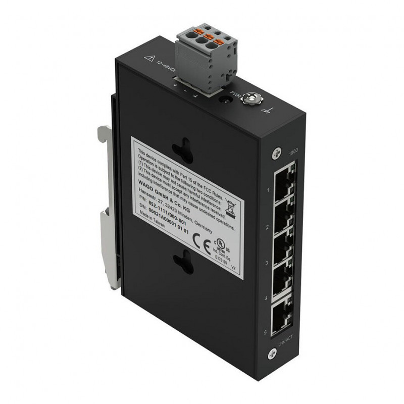 "Wago 852-1111/000-001. Basic switching RJ-45 Ethernet ports type: Gigabit Ethernet (10/100/1000), Basic switching RJ-45 Ethernet ports quantity: 5. MAC address table: 2000 entries. Networking standards: IEEE 802.1p, IEEE 802.3, IEEE 802.3ab, IEEE 802.3u, IEEE 802.3x. DC input voltage: 12 - 48 V"\n