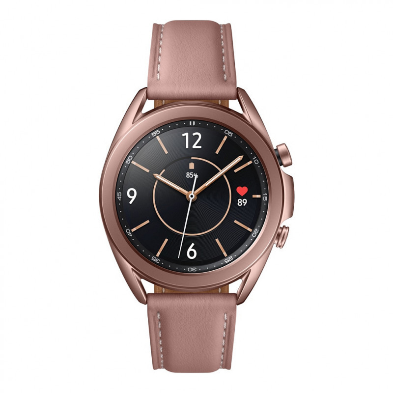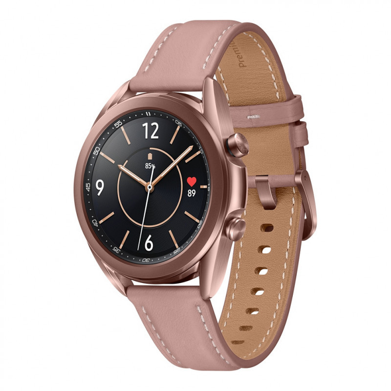 "Samsung Galaxy Watch3 . Display diagonal: 3.05 cm (1.2""), Display technology: OLED, Display resolution: 360 x 360 pixels, Touchscreen. Processor frequency: 1150 MHz. RAM capacity: 1024 MB, Flash memory: 8 GB. Wi-Fi. GPS (satellite). Battery capacity: 247 mAh. Weight: 48.2 g. Band material: Leather, Band colour: Bronze"\n"CLASSIC AND PREMIUM