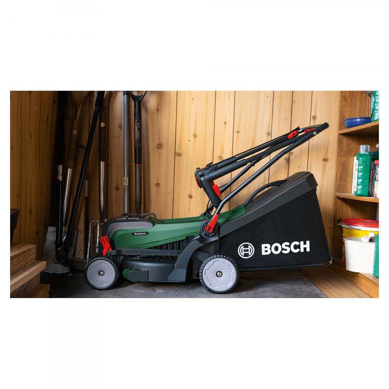 "Bosch 37-550. Type: Walk behind lawn mower, Maximum lawn area: 550 m², Cutting width: 37 cm. Power source: Battery, Charging time: 95 h, Battery type: Built-in battery. Width: 400 mm, Depth: 1355 mm, Height: 1050 mm"\n