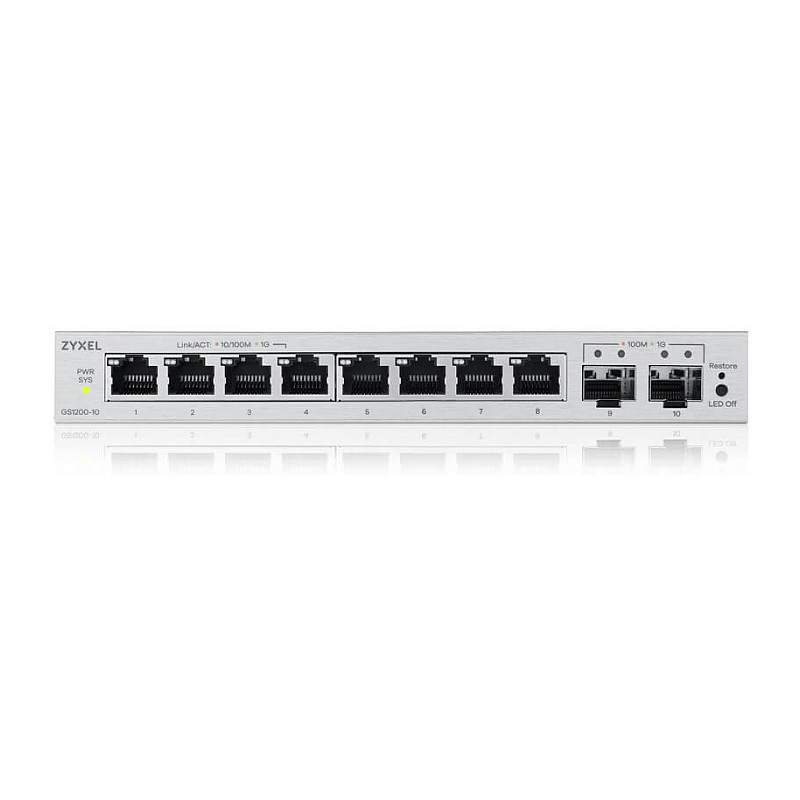 "Zyxel GS1200-10v3. Switch type: Managed, Switch layer: L2. Basic switching RJ-45 Ethernet ports type: Gigabit Ethernet (10/100/1000), Basic switching RJ-45 Ethernet ports quantity: 8. Full duplex. MAC address table: 4000 entries, Switching capacity: 20 Gbit/s. Networking standards: IEEE 802.1Q, IEEE 802.1p, IEEE 802.3, IEEE 802.3ab, IEEE 802.3ad, IEEE 802.3az, IEEE 802.3u, IEEE.... Power connector: DC-in jack. Form factor: Desktop"\n"Speedy Gigabit Performance and Diversified Options