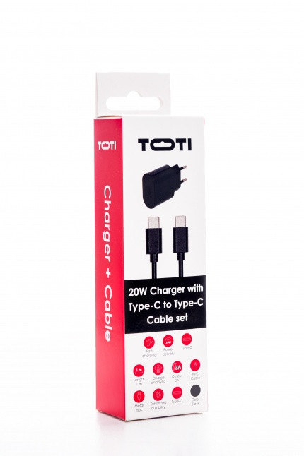 SEEK TOTI 20W Type-C PD Wall Fast Charger with Type-C to Type-C, 1 m PVC Data Cable 3A, Black