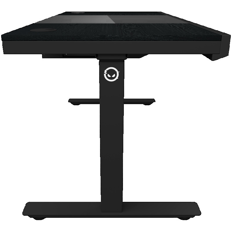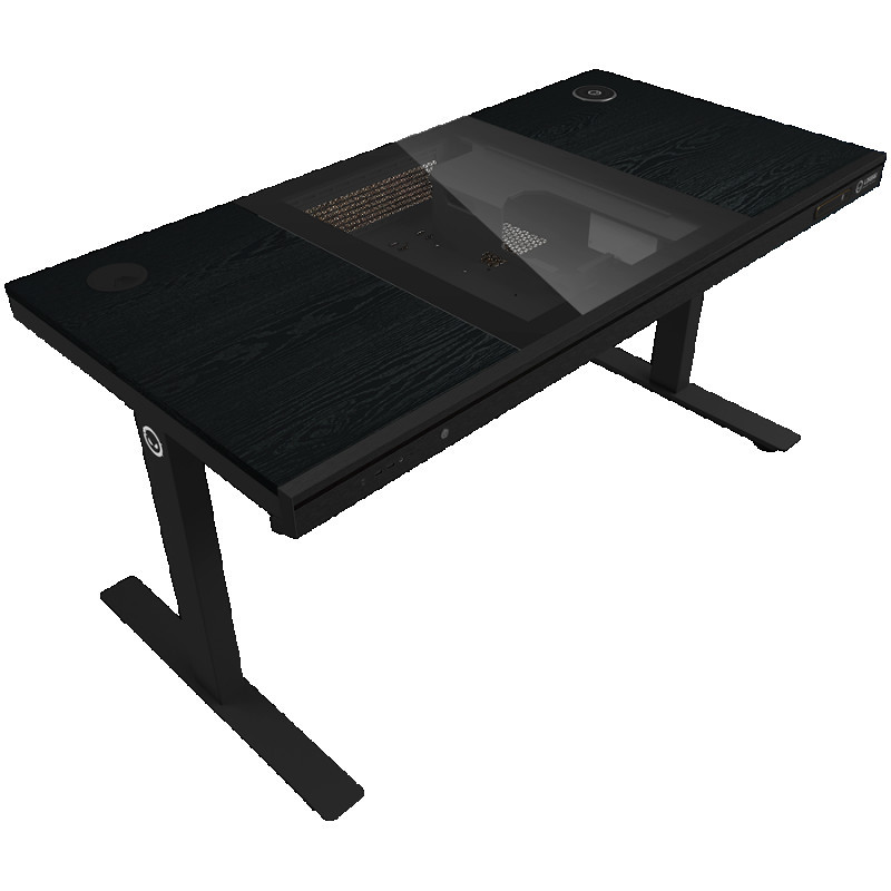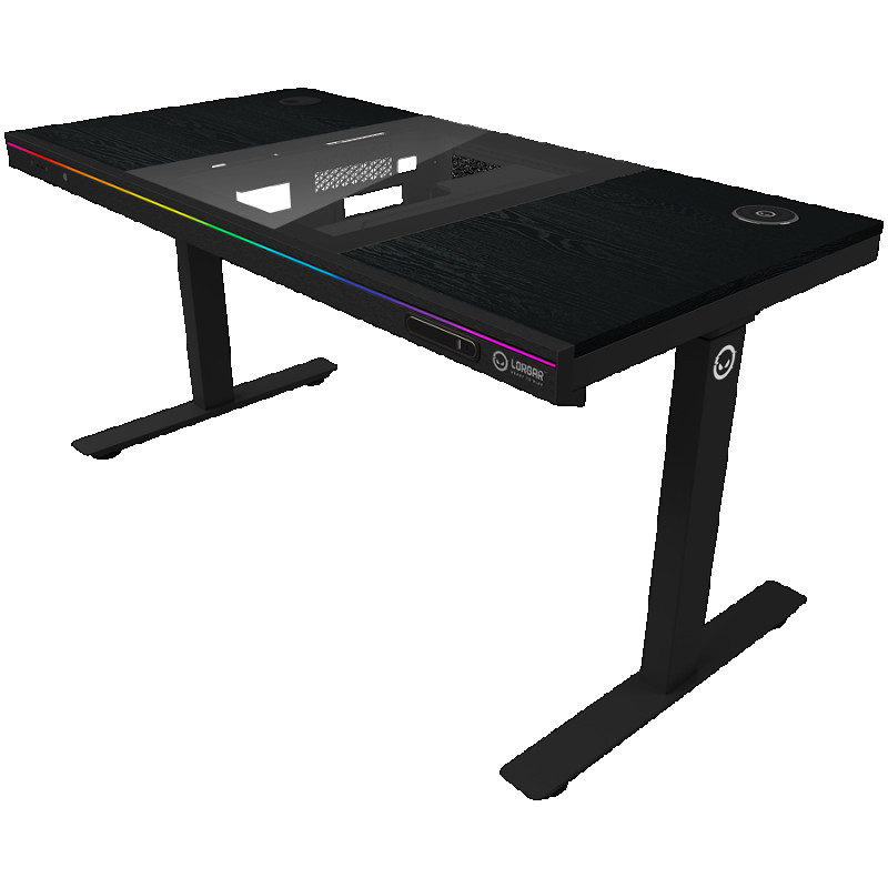 Dual-motor sit/stand adjustable-height gaming desk with built-in PC case, wireless charger, RGB lighting, control panel, and USB ports, PB melamine surface tabletop, black.