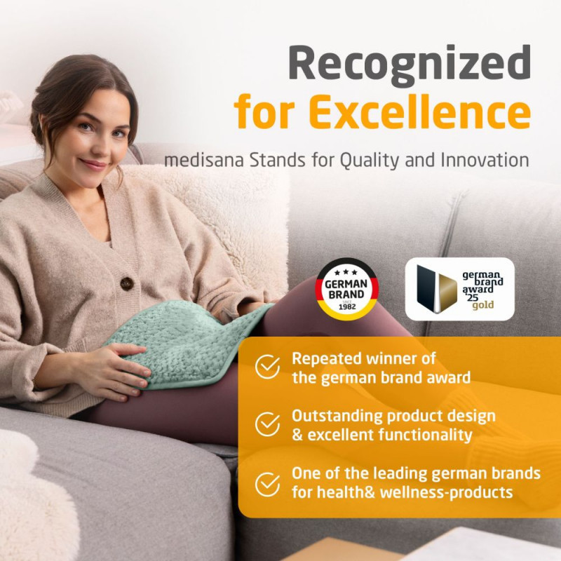 Medisana HP 517 Heating Pad, Savage Green – komfortiška elektrinė šildymo pagalvė, skirta raumenų atsipalaidavimui, skausmo mažinimui ir komfortui namuose. Reguliuojama temperatūra leidžia pasirinkti tinkamiausią šilumos lygį. Minkšta ir maloni žalios spalvos medžiaga (Savage Green) suteikia patogumą naudojant ir natūralų, ramų interjero akcentą. Ergonomiškas dizainas leidžia šildyti įvairias kūno vietas: nugarą, pečius, pilvą ar kojas.