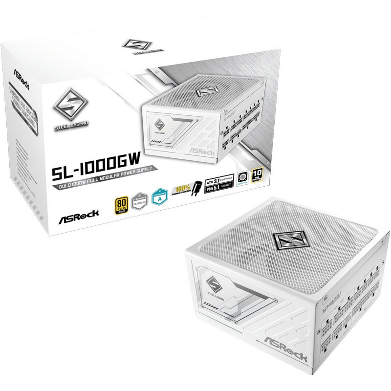 "Asrock SL-1000GW Steel Legend. Total power: 1000 W, Power protection features: Overheating, Over current, Overload, Over voltage, Short circuit. Motherboard power connector: 20+4 pin ATX, Motherboard power cable length: 60 cm, SATA power cable length: 120,450 mm. Purpose: PC, Power supply unit (PSU) form factor: ATX, 80 PLUS certification: 80 PLUS Gold. Product colour: White, Cooling type: Active, Fan diameter: 13.5 cm. Width: 150 mm, Depth: 150 mm, Height: 86 mm"\n"Native PCIe 12V-2x6 Cable