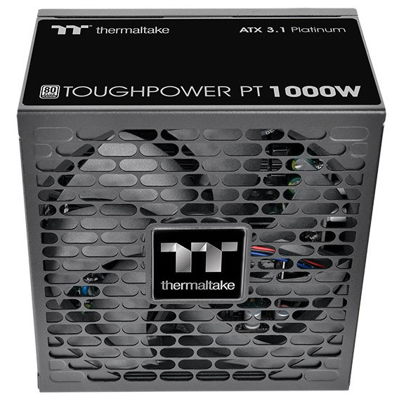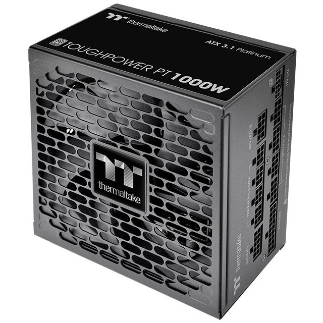 "Thermaltake Toughpower PT 1000W. Total power: 1000 W, AC input voltage: 100 - 240 V, AC input frequency: 47 - 63 Hz. Motherboard power connector: 24-pin ATX, Motherboard power cable length: 55 cm, SATA power cable length: 450,600,750 mm. Purpose: PC, Power supply unit (PSU) form factor: ATX, 80 PLUS certification: 80 PLUS Platinum. Product colour: Black, Cooling type: Active, Fan diameter: 13.5 cm. Safety: CE/UKCA/FCC/ICES/CB/TUV/cTUVus/LVD/CCC/BSMI/ S-MARK/EAC/RCM"\n"The Toughpower PT 1000W Platinum is ATX 3.1 compatible, 80 PLUS Platinum certified, and supports native PCIe Gen 5.1 (12+4pin) for next-gen GPU power. Delivers 1000W continuous output at 40°C.