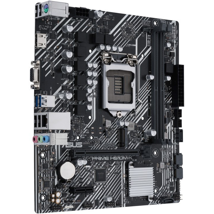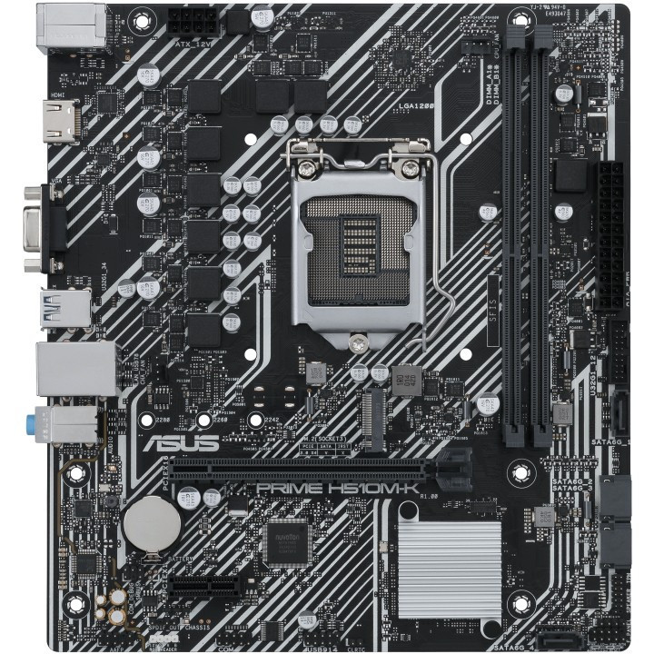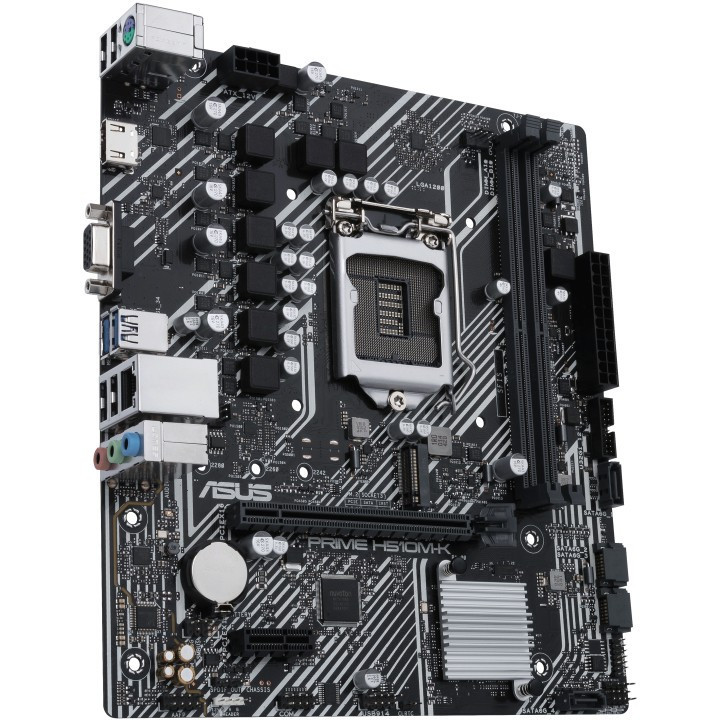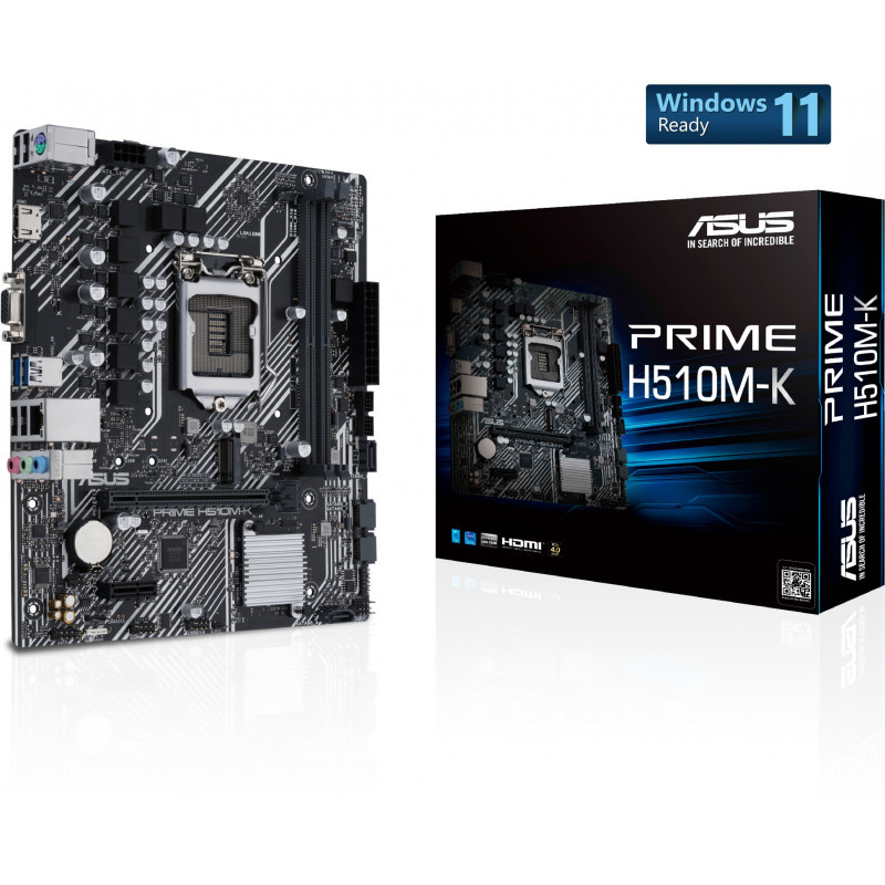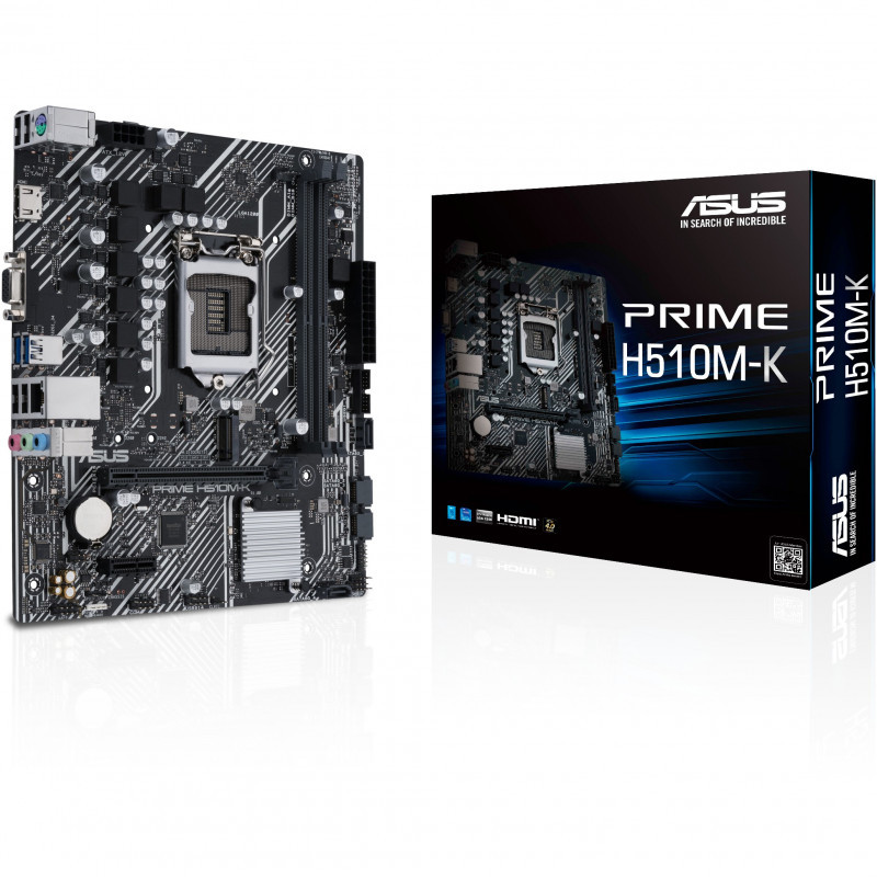 "ASUS PRIME H510M-K. Processor manufacturer: Intel, Processor socket: LGA 1200 (Socket H5), Compatible processor series: Intel® Celeron®, Intel® Core™ i3, Intel® Core™ i5, Intel® Core™ i7, Intel® Core™ i9, Intel Pentium G. Supported memory types: DDR4-SDRAM, Maximum internal memory: 64 GB, Memory slots type: DIMM. Supported storage drive interfaces: M.2, PCI Express 3.0, SATA III, Supported storage drive types: HDD & SSD. Maximum resolution: 3840 x 2160 pixels. HDMI version: 1.4/2.0, USB connector type: USB Type-A"\n"ASUS Prime series motherboards are expertly engineered to unleash the full potential of 11th and 10th Generation Intel® processors. Boasting a robust power design, comprehensive cooling solutions and intelligent tuning options, PRIME H510M-K provides daily users and DIY PC builders a range of performance tuning options via intuitive software and firmware features.