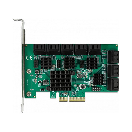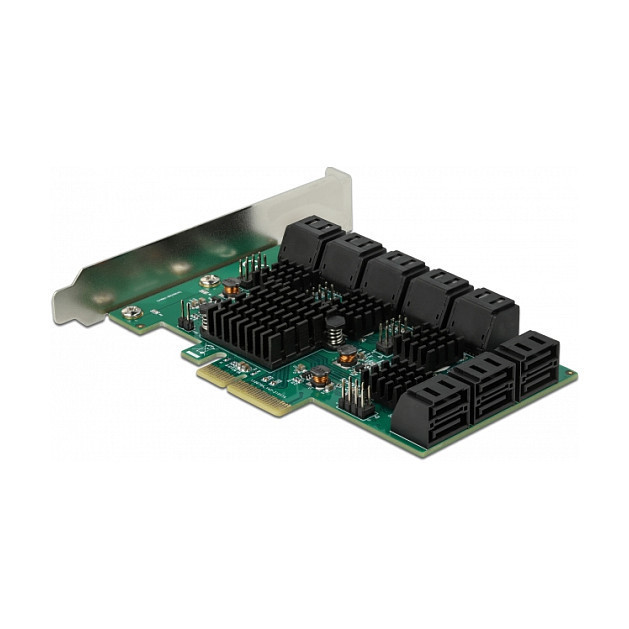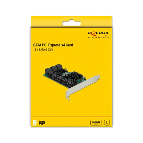 "DeLOCK 16 port SATA PCI Express x4 Card. Host interface: PCIe, Output interface: SATA. Product colour: Green, Grey, Purpose: PC. Data transfer rate (max): 6 Gbit/s. Windows operating systems supported: Windows 10, Windows 10 x64, Windows 8.1, Windows 8.1 x64, Server operating systems supported: Windows Server 2019. Quantity per pack: 1 pc(s), Package type: Box"\n"The PCI Express card by Delock expands a PC by 16 internal SATA ports. Different devices such as SSDs, hard drives, DVD-drives etc. can be connected to the card."
