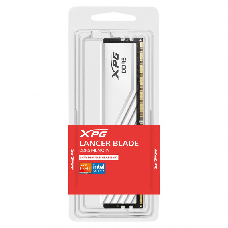 "XPG Lancer Blade. Component for: PC, Internal memory: 16 GB, Memory layout (modules x size): 1 x 16 GB, Internal memory type: DDR5, Memory clock speed: 6400 MHz, Memory form factor: 288-pin DIMM, CAS latency: 39"\n"Compact Low-Profile Heatsink Design