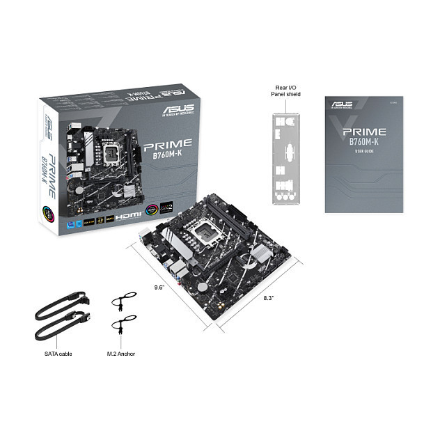 "ASUS PRIME B760M-K. Processor manufacturer: Intel, Processor socket: LGA 1700, Compatible processor series: Intel® Celeron®, Intel® Pentium® Gold, Intel® Core™ i3, Intel® Core™ i5, Intel® Core™.... Supported memory types: DDR5-SDRAM, Maximum internal memory: 96 GB, Memory slots type: DIMM. Supported storage drive interfaces: M.2, SATA III, Supported storage drive types: HDD & SSD, RAID levels: 0, 1, 5, 10. Ethernet interface type: 2.5 Gigabit Ethernet. Component for: PC, Motherboard form factor: micro ATX, Motherboard chipset family: Intel"\n"B760M-K