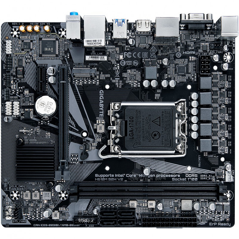 "GIGABYTE H610M S2H V2 Motherboard - Supports Intel Core 14th CPUs, 4+1+1 Hybrid Phases Digital VRM, up to 5600MHz DDR5, 1xPCIe 3.0 M.2, GbE LAN, USB 3.2 Gen 1. Processor manufacturer: Intel, Processor socket: LGA 1700, Compatible processor series: Intel® Celeron®, Intel® Core™ i3, Intel® Core™ i5, Intel® Core™ i7, Intel® Core™ i9,.... Supported memory types: DDR5-SDRAM, Maximum internal memory: 96 GB, Memory slots type: DIMM. Supported storage drive interfaces: M.2, SATA, Supported storage drive types: HDD & SSD. Graphics card family: Intel, Graphics card: HD Graphics, Maximum resolution: 4096 x 2304 pixels. Ethernet interface type: Gigabit Ethernet"\n"Elevate your computing experience with GIGABYTE's renowned motherboard series: AORUS, AERO, and GIGABYTE. Featuring innovative designs and advanced features, these boards offer exceptional performance and reliability. Whether you're a gamer, content creator, or professional, our series cater to your needs, ensuring uncompromising quality and cutting-edge"