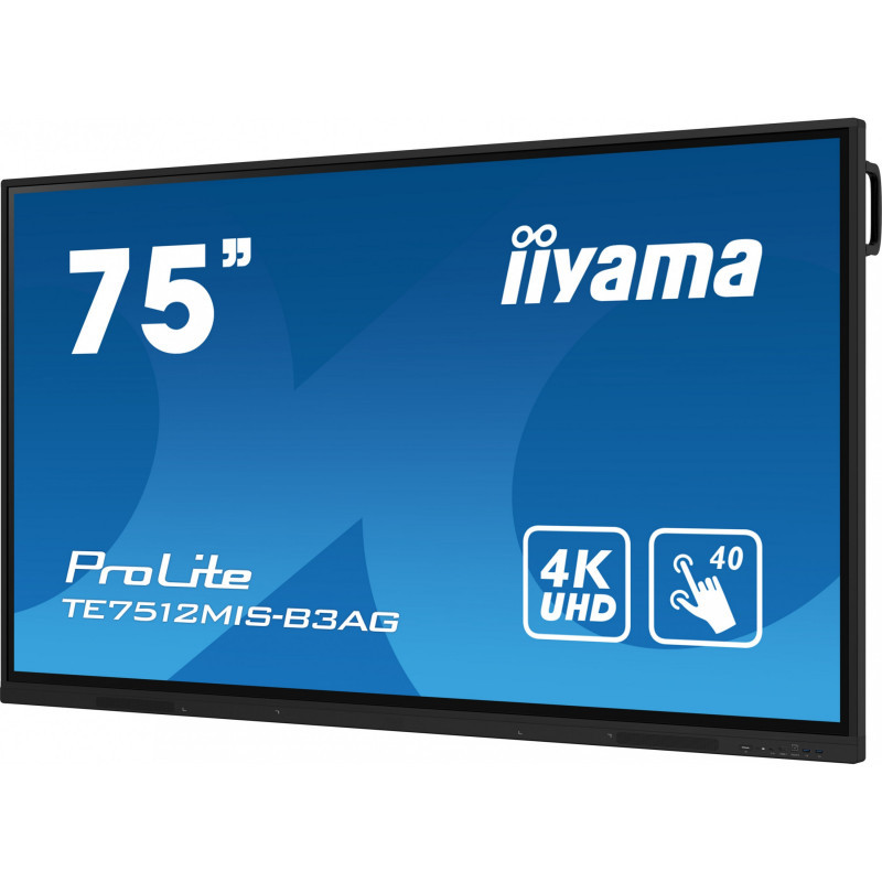 "iiyama TE7512MIS-B3AG. Product design: Kiosk design. Display diagonal: 190.5 cm (75""), Display technology: LCD, Display resolution: 3840 x 2160 pixels, Display brightness: 400 cd/m², HD type: 4K Ultra HD, Touchscreen. Wi-Fi. Operating hours (hours/days): 24/7. Operating system installed: Android 11. Product colour: Black"\n"The TE7512MIS-B3AG is an exceptional 4K UHD interactive display designed by iiyama to enhance collaboration, communication, and engagement. With key features like Zero Airgap LCD screen eliminating parallax, accurate PureTouch-IR, iiWare 10 with Android 11, Wifi, and the iiyama DMS (Device management System), this display transforms the way you engage with content, making it an indispensable tool for modern workspaces and educational settings. Boasting a new 4K Interface with User Profiles for simple login and access to your very own bespoke application and Cloud Drives or harmonize with your existing estate and unleash the true power of Windows and Office applications. iiyama TE7512MIS-B3AG becomes a highly personalised & flexible device within a busy hybrid environment for multiple users. Share wirelessly more easily than ever before with iiyama Share and EShare app, bringing effortless ideation and efficient collaboration in your enterprise or school. This affordable display transforms the modern workplaces, educational institutions, dynamic meeting spaces and beyond. Elevate your interactive experience with the iiyama TE12 SERIES displays and embrace the future of visual communication."