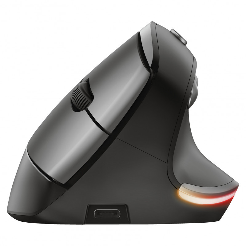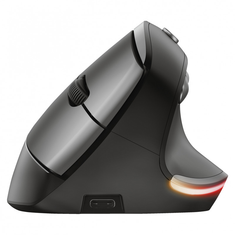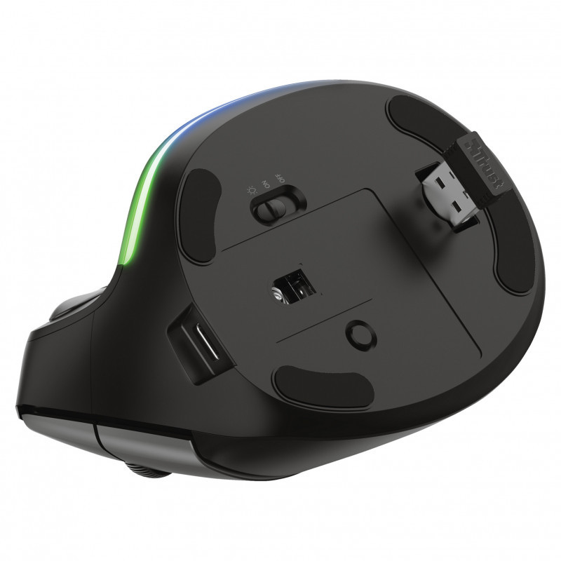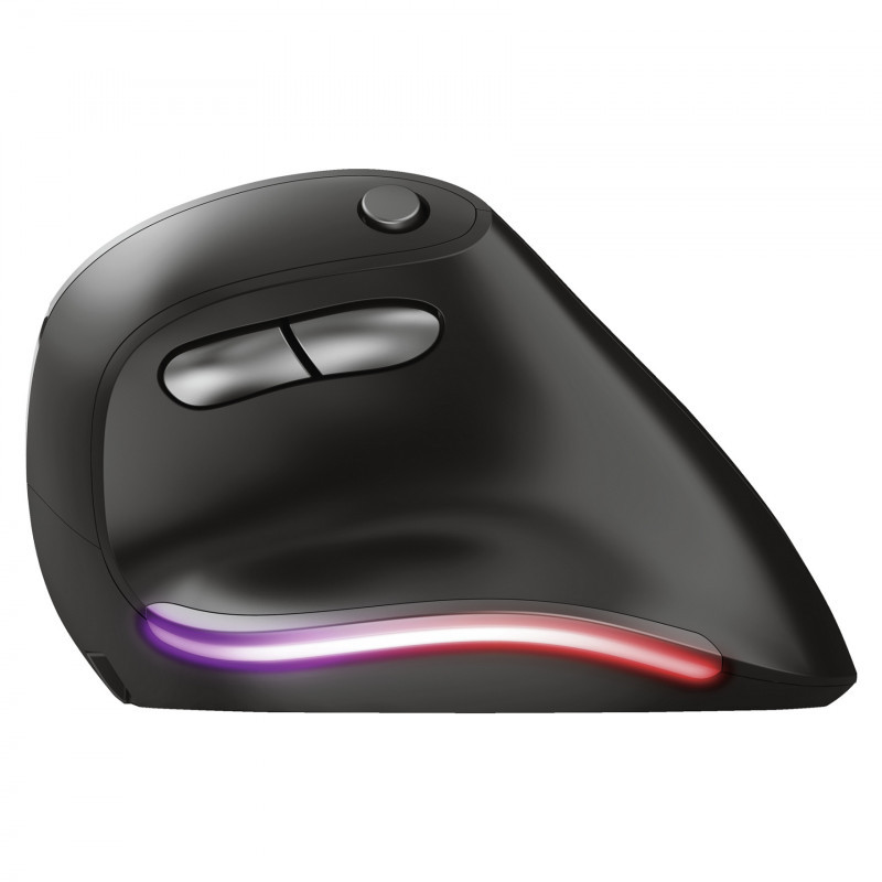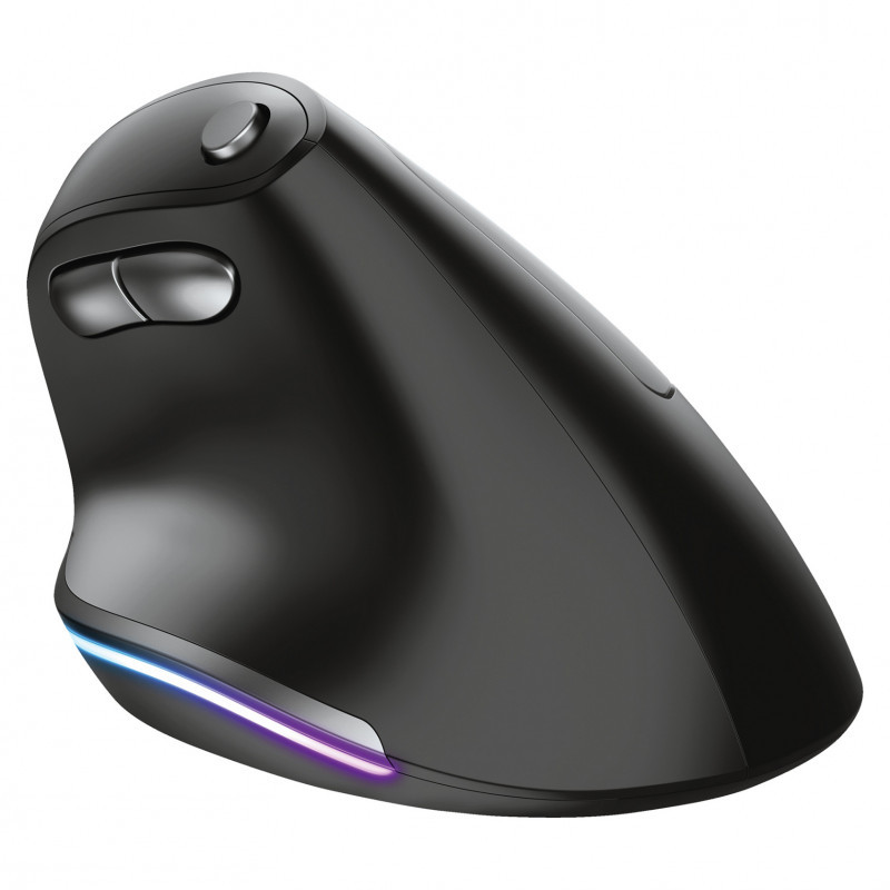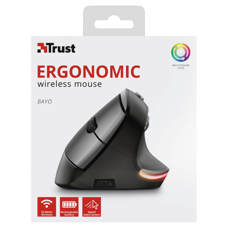 "Trust Bayo. Form factor: Right-hand. Movement detection technology: Optical, Device interface: RF Wireless, Movement resolution: 2400 DPI, Buttons type: Pressed buttons, Buttons quantity: 6, Scroll type: Wheel. Illumination colour: Multi. Power source: Batteries. Product colour: Black"\n"Wireless, rechargeable lighted mouse with an ergonomic, vertical design to reduce arm and wrist strain, and with lighting