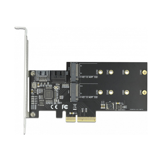 "DeLOCK 3 port SATA and 2 slot M.2 Key B PCI Express x4 Card - Low Profile Form Factor. Host interface: PCIe, Output interface: M.2, SATA. Data transfer rate (max): 6 Gbit/s. Cables included: SATA"\n"The PCI Express card by Delock expands a PC by three internal SATA ports and two M.2 slots. Different devices such as SSDs, hard drives, DVD-drives etc. and two M.2 modules in 2280, 2260, 2242 or 2230 format can be connected to the card."