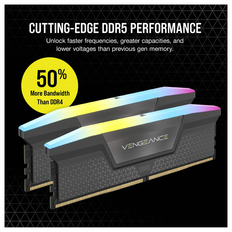 "Corsair Vengeance RGB . Component for: PC, Internal memory: 32 GB, Memory layout (modules x size): 2 x 16 GB, Internal memory type: DDR5, Memory clock speed: 6000 MHz, Memory form factor: 288-pin DIMM, CAS latency: 36, Product colour: Black"\n"VENGEANCE RGB DDR5 DRAM