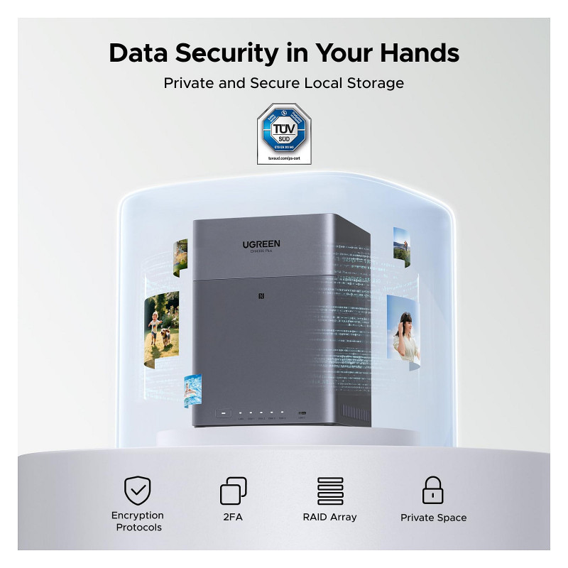 Your Data, You Control:No third-party clouds, no hidden access, UGREEN NAS provides a more secure and private data storage solution. It stores data locally on your private hard drives and does automatic backups. Thus, you can keep full control over it. The advanced encryption is TRUSTe certified in the United States and is awarded the first (and only) ETSI EN 303 645 certification mark for NAS products by TÜV SÜD Group.