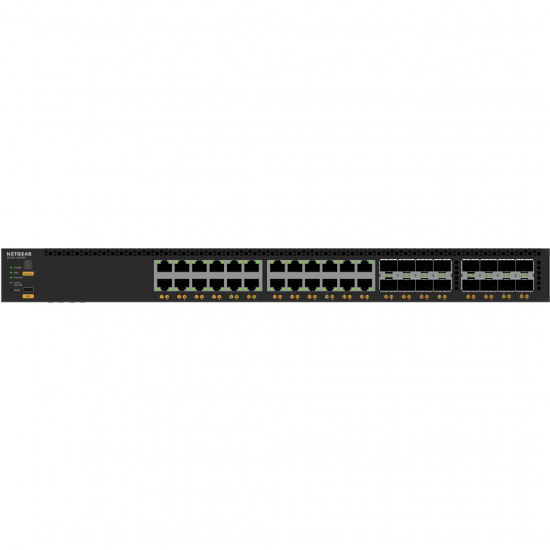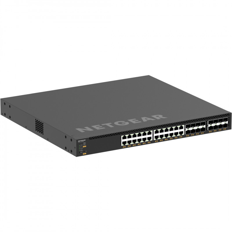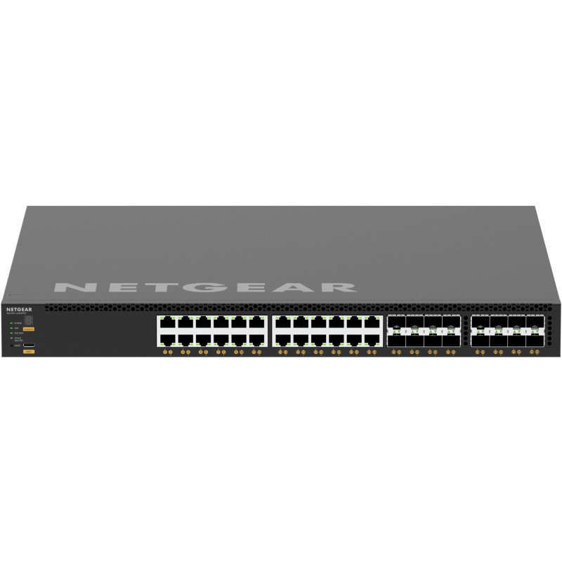 "NETGEAR M4350-24X8F8V. Switch type: Managed, Switch layer: L3. Basic switching RJ-45 Ethernet ports type: 10G Ethernet (100/1000/10000), Basic switching RJ-45 Ethernet ports quantity: 24. Full duplex. MAC address table: 16000 entries, Switching capacity: 1040 Gbit/s. Networking standards: IEEE 802.1D, IEEE 802.1Q, IEEE 802.1Qav, IEEE 802.1s, IEEE 802.1w, IEEE 802.1x, IEEE 802.3, IEEE.... Power over Ethernet (PoE). Rack mounting, Form factor: 1U"\n"POWER AND THROUGHPUT