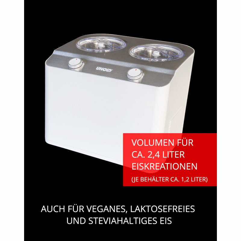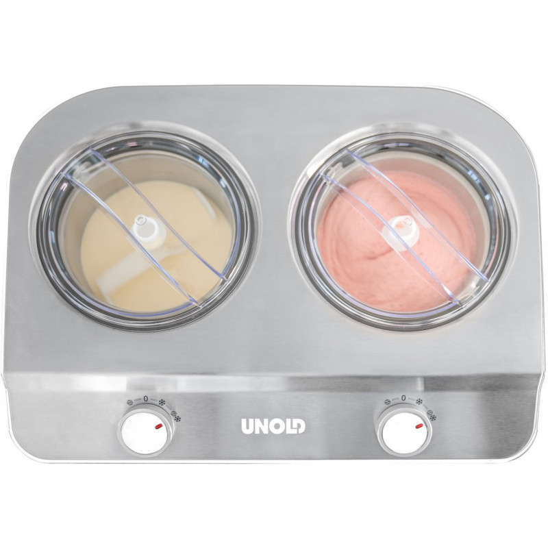 "Unold Doppio. Product type: Compressor ice cream maker, Bowl capacity: 2.4 L, Number of bowls: 2 bowls. Width: 409 mm, Depth: 307 mm, Height: 380 mm. Power: 250 W, AC input voltage: 220 - 240 V, AC input frequency: 50 Hz. Ice cream type: Ice cream, Sherbet, Yoghurt. Package width: 409 mm, Package depth: 307 mm, Package height: 394 mm"\n"The Doppio ice cream maker is ideal for making different types of ice cream at the same time, as it has two separate ice cream containers with a capacity of 1.2 liters each. Thanks to the self-cooling compressor, you can make creamy ice cream in just 30 minutes. It is easy to use thanks to the rotary knob and the stainless steel ice cream containers are removable and easy to clean. With a freezing range of -35 °C and a durable motor, this ice cream maker is designed to be used continuously."