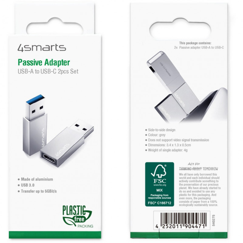 "4smarts 540275. Host interface: USB Type-A, Output interface: USB Type-C, Host interface gender: Male. Product colour: Grey, Cooling type: Passive. Data transfer rate (max): 5 Gbit/s. Width: 32 mm, Depth: 14 mm, Height: 7 mm. Quantity per pack: 2 pc(s), Package width: 125 mm, Package depth: 45 mm"\n"With our adapter, you can connect modern USB-C 3.0 devices to standard USB-A 3.0 ports at a speed of 5 Gbps and transfer large amounts of data in just a few seconds.