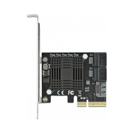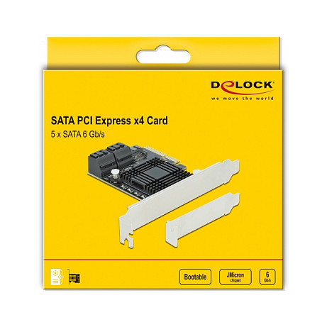 "DeLOCK 5 port SATA PCI Express x4 Card - Low Profile Form Factor. Host interface: PCIe, Output interface: SATA. Data transfer rate (max): 6 Gbit/s. Cables included: SATA"\n"The PCI Express card by Delock expands a PC by five internal SATA ports. Different devices such as SSDs, hard drives, DVD-drives etc. can be connected to the card."