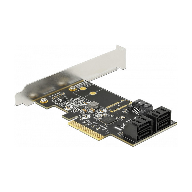 "DeLOCK 90395. Host interface: PCIe, Output interface: SATA. Product colour: Green. Data transfer rate (max): 6 Gbit/s. Cables included: SATA, Package type: Hanging box"\n"The PCI Express card by Delock expands a PC by five internal SATA ports. Different devices such as SSDs, hard drives, DVD-drives etc. can be connected to the card."