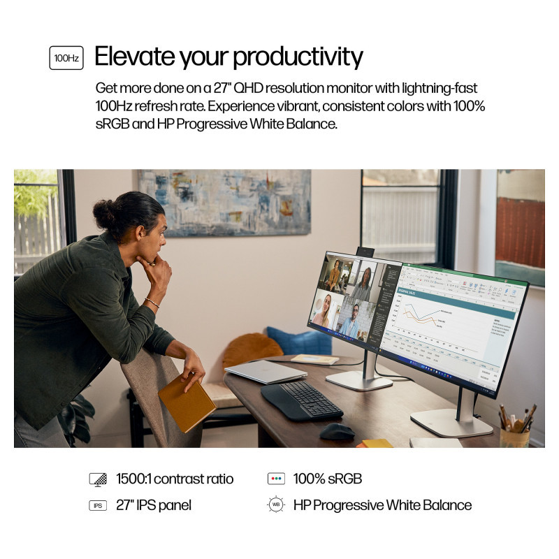 Get more out of your workday with the HP Series 5 Pro 27” QHD Monitor. Create the setup that works for the way you work, wherever you work, with refined visual clarity and adjustable comfort built into a sleek, modern design."