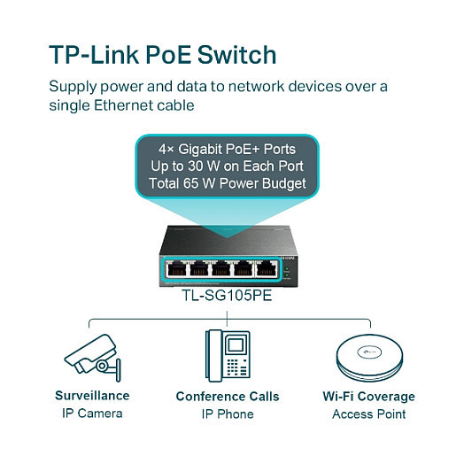 "TP-Link 5-Port Gigabit Easy Smart PoE Switch with 4-Port PoE+. Switch type: Managed, Switch layer: L2. Basic switching RJ-45 Ethernet ports type: Gigabit Ethernet (10/100/1000), Basic switching RJ-45 Ethernet ports quantity: 5. MAC address table: 2000 entries, Switching capacity: 10 Gbit/s. Networking standards: IEEE 802.1Q, IEEE 802.1p, IEEE 802.3ab, IEEE 802.3af, IEEE 802.3at, IEEE 802.3i, IEEE 802.3u, IEEE.... Power over Ethernet (PoE)"\n"The TL-SG105PE is an 5-port Gigabit Easy Smart Switch with 4 PoE+ ports, represents a powerful upgrade from an unmanaged switch. It is designed specially for small businesses that require simple network management and PoE function. The TL-SG105PE can connect and power up to four PoE devices, such as wireless access points (APs), IP cameras, and IP phones. Through its web-based user interface and management utility, the TL-SG105PE offers a variety of useful features, including network monitoring, traffic prioritization, PoE Auto Recovery and enhanced QoS. Additionally, with port-based, tag-based and MTU VLAN, TL-SG105PE can improve security and meet more network segmentation requirements.