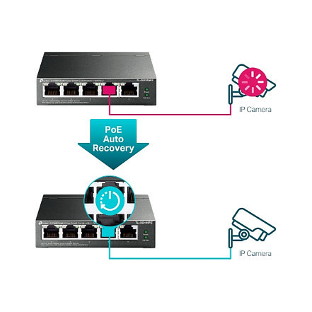 Additionally, to improve security and network performance, TL-SG105PE supports MTU VLAN, port-based VLAN and 802.1Q-based VLAN functions. PoE Auto Recovery automatically reboots your dropped or unresponsive PoE-powered devices.